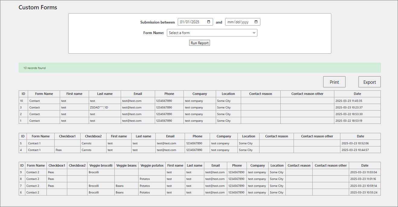 A lightweight, open-source, WordPress plugin to create custom forms for your WP website’s frontend and an administration tool to view, print and export form submission reports from the backend.